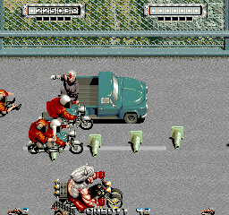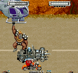 All of this makes for a focused and manic game, with vehicles constantly skidding out and exploding all over the screen. It’s very satisfying to learn as well, since one has to actually hit the center of mass of an enemy vehicle with Mad’s tonfa, making mindless button mashing worthless in the face of good timing. This combined with being able to ram enemies by braking at the right time helps keep up the game’s intense pacing makes for the kind of rewarding experience and control over the combat that all great action games work to achieve. The enemies themselves are all cool and ridiculous in their own way. Players will be fighting against other guys on motorcycles, but also against folks on hangliders, a Citroen van with a peace sign on it that attacks by dumping out an endless stream of exploding miniature version of itself (Mitchell must have been big fans of The Dead Pool as well), guys on three wheeled vehicles that are so chill they lean back in the seat with their arms crossed and steer with their feet, and most importantly an ape. Not just any ape, but an ape donning a crown, gold chains, and spiked Mad Max 2: The Road Warrior styled armor that attacks Mad by jumping off his vehicle onto a helicopter and punching at the player from above.
