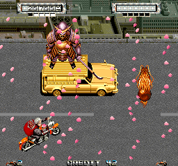 What little character information we’re presented with is a bit out there, even by late 80s arcade game standards when the game’s ending is reached. After racing around New York City (and “A Ravine”), players must defeat a giant samurai standing atop a gold plated station wagon. He has a small dragon helping him out as well, and as an extra touch an endless rain of cherry blossom petals envelops the screen during the entire fight. This samurai refers to himself as The Slasher, and after beating him we’re presented with a nonsensical epilogue where he and Mad careen into the Chrysler building, causing a massive explosion after a brief scene of an alien walking around and two men arguing in an office. The game’s title screen, however, is fantastic, with the game’s title made up for motorcycle parts accompanied by a film strip showing off various enemies of the game in an art style evocative of various US and Japanese punk and gang films like Burst City.