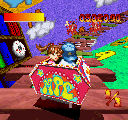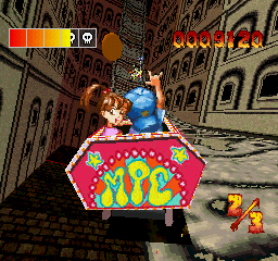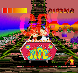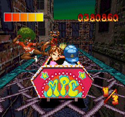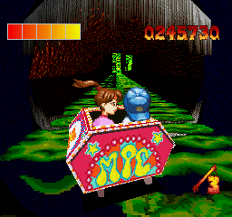 The levels take you through a plethora of locations, ranging from scary castles to the ocean to Wonderland to the inner cities. Each roller coaster has its own unique enemies, and while the game may move too fast for you to see these enemies in close detail, pausing can show that a lot of work went into these details. Most of the game is constructed out of polygons, but the boy and girl are sprites, allowing them to appear more expressive than PS1-era polygonal characters would typically allow. The music, while slightly limited in terms of variety, is fitting for what goes on in the game, consisting mainly of instrumental thrash metal and hardcore punk tracks.