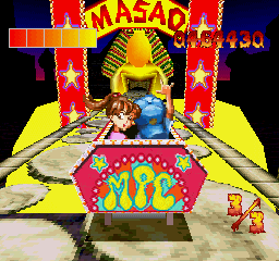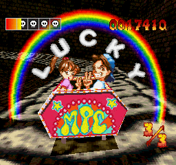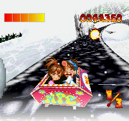 In Mad Panic Coaster, you control two elementary school students, Bakuyan and Kyako, as they try to survive a ride on 15 hellish roller coasters. The premise is that these tracks were designed by a crazed man named Dr. Jones, who became some sort of bio-mutant, and worked for years to create the best roller coaster in the world. Since these were designed by an insane person, they obviously weren’t subject to any safety testing, and they don’t have any rails or barriers of any sort. It’s up to you to steer the roller coaster car using the D-pad to make sure it stays on the track. The roller coasters also have various monsters, traps, and jumps to avoid. In addition to jumping over gaps, hitting Square will make the girl throw some sort of yellow ball projectile that explodes at a long range, while hitting Circle will make the boy throw that same type of projectile at a shorter range. Falling off the track or getting hit by something will cost you health, and once you run out, you must start the level all over again. Once you make three laps around the track, a rainbow with the words “lucky” form around you as the car comes to a stop, and you move on to the next level. Every three roller coasters, a boss will be fought after completing the third lap. This boss is similar to the regular enemies, except that they take many more hits to kill. To defeat them, you either throw enough projectiles at them or survive another three laps.