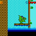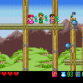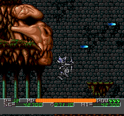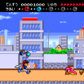 Instead it does just the opposite. The main robot you play as can do nothing but swing a sword in front of it. Another form has a staff with much longer range and can also create a useless force field around itself. The third though, the third one can shoot a rapid firing projectile in almost any direction and can fly. Since any items you pick up are shared between all three, and if any one of them takes a single hit you lose a life, there’s no reason to use anything but the one that can shoot projectiles across the screen and also fly. In addition, you can defeat enemies by jumping on top of them, so the flying character has an even bigger advantage over the other two.