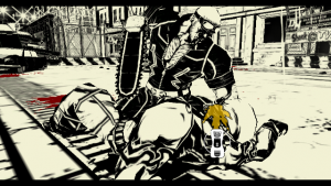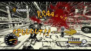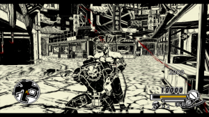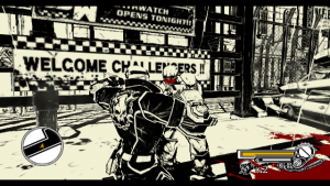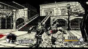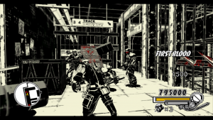 It cannot be stated how beautiful of a game MadWorld is. It only uses three colors: Black, white, and red. The red is for the blood, and it is everywhere. It gushes out when you chainsaw enemies in half. It flows when you smash them against spike beds. It seeps when you slam a garbage bin lid on them. Really, it’s easier to list times when there isn’t blood coming from somewhere. It sprays onto the carefully designed comic like levels and contrasts perfectly with the spectacle, and it gets on Jack’s body to boot. It’s the period on all the constant gore and pain the game revels in, and backed even further by gruesome finisher moves. Every boss gets one special to them as well, ranging from being blasted away by their own revolvers to getting dragged around by a chain on a bike. Even mundane actions are nasty, with one of the most common tactics being shoving street sights right into the brain.