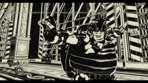 MadWorld is like a terrible B-movie brought to horrible life, and it’s certainly presented as much. Since this game was made for a western market, Platinum looked into getting western voice actors and comedians on staff. The end result are two narrator characters played by Greg Proops (The Drew Carey Show, …Bob the Builder!?) and John DiMaggio (Futurama, Adventure Time) named Howard “Buckshot” Holmes and Kreese Kreely, who may be the most well remembered elements of the game. The two constantly talk over gameplay, commenting on everything and sharing disgusting stories about past Death Watch games. Most of their dialog was even improvised, ignoring continuity with the game for the sake of good jokes, and that was definitely for the best. DiMaggio’s role here is particularly amusing, because you get to hear Bender use really bad curse words, which is way funnier than you’d think. The rest of the voice cast is strong as well, especially Jim Ward as major villain Agent XIII, Steve Blum as Jack, and Reno Wilson’s hilariously overplayed role as The Black Baron.