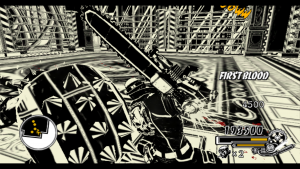 As a game, MadWorld was designed to be much more beginner friendly than their normal output, though it’s certainly not casual. Some nasty enemies get thrown your way, including chainsaw wielding bull men, and it can be easy to be overwhelmed by enemies if you’re not careful. The goal of each stage is to rack up points by killing enemies in creative ways. After getting a certain amount of points, you reach a milestone that triggers a new event in the area, like new weapons or obstacles, or minibosses that will hunt you down through the stage. Every area of the game has a different theme, and all of them rather tacky to match the reality TV theme. There’s an abandoned military base with alien technology, a cheesy looking haunted mansion with rollerblading grim reapers and zombies hanging around, and even a Japanese castle filled with ninjas you can stuff into firework tubes.