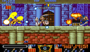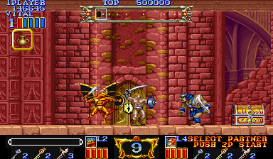 There are few real flaws with the game, so much as just strange decisions, or perhaps mismatched expectations. It’s weird that there are a total of nine character classes, but you can only control the main fighter dude, with the rest just basically being power-ups. For as speedy as the game is, 51 stages is kind of long, and by the time you’ve made it about two-thirds of the way through the game, you’ve probably seen most of what it has to offer. (To combat this, as long as the appropriate dip switch is set on the board, you can start the game at certain checkpoints on higher floors, and the game is even nice enough to start you off with the appropriate armament and companion.) While some stages have some platforming elements, or obstacles to dodge (guillotines, swinging balls, etc.), most stages do just involve careening forward and beating up on things, so there’s not much variety, despite how fun it all feels. So in that aspect, gamers expecting something a little more like a run-and-jump a la Black Tiger may find it disappointing.