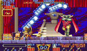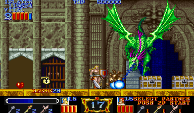 Altogether, between the multitude of ally characters, their own individual power levels, and the many power-ups, there’s a fairly substantial amount of depth to Magic Sword. Indeed, it plays to the strengths of what the game is trying to be. Most other action-RPGs try to provide depth by giving you large areas to explore (which isn’t necessarily a negative) and changing the player’s strength based on what kind of items you’ve found or score you’ve obtained (which tends to either make you too weak or too powerful). These were both aspects of Black Tiger, but Magic Sword very much wants to give the thrill of running forward and hacking up bad guys, so the RPG elements complement the usual arcade power-up structure without messing with the pacing or balance.