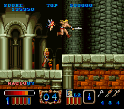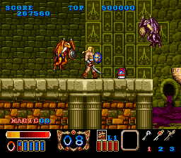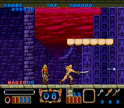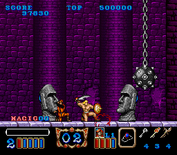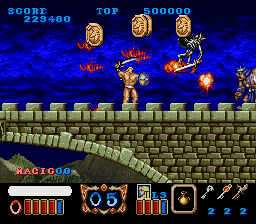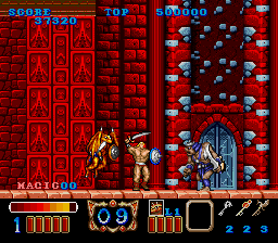 Magic Sword was ported to the SNES in 1992, two years after its arcade release. With less than a third of the available ROM space, many graphics had to be downgraded – the sprites aren’t as detailed nor as well animated, and the backgrounds lose much of their richness. Some enemies have been removed, two player mode is gone, and while the core gameplay is faithful, there is also substantial slowdown, a regular problem with many early SNES games. Due to the drastically different sound hardware, the music loses some of that CPS-1 FM synth crunchiness, but the conversion still ends up sounding pretty good. The arcade game also included a few hidden routes that let you warp ahead a few stages, which have been removed here (though you can still pick your starting floor). It is a bit easier due to the lesser amount of enemies you’ll have to face, though simultaneously it’s not as satisfying with less things to cut through. Even though it is a notable downgrade, as far as home conversions, it’s still pretty alright.