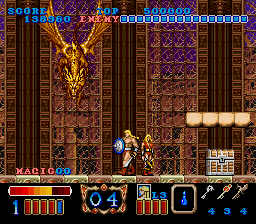 In Magic Sword, you control one of two buff heroes – not given any proper names in English but named Alan and Belger (no relation to the Final Fight boss, probably) according to assorted Japanese supplementary material – to destroy the evil lord Drokmar. He makes his home on the top of a massive 50-floor tower, drawing his power from a magical artifact called the Black Orb. To reach him, you need to scale the tower floor-by-floor, occasionally stopping for a boss battle.