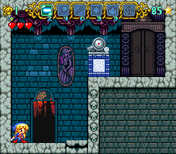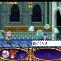 The adventure starts immediately after the end of the cinema, with the princess exploring the surroundings of the castle on a stormy night, namely the houses of the town around it, using beds as makeshift trampolines and so on. In one room of these a mid-boss suddenly pops up: a wizard who uses his magic to make furniture float. After defeating him, the princess passes through some more houses and the sewers/dungeons below the town to find the first of several magic spells, until she emerges at sunrise and comes to a church, where the statue inside shatters to reveal a winged demon who is the main stage boss. And this is just the first level! The next levels (a forest, a canyon, a magical ice palace in the clouds, another palace and finally the maze-like castle of the dark lord) aren’t as elaborate, but each one gets trickier than the last with more traps, timed puzzles, hidden routes and other standard platform obstacles. However, it never gets overwhelming, also thanks to the many life-restoring candies and cakes scattered everywhere. There are infinite continues, but no passwords or save states, so you’ll still have to complete the whole game in one setting.