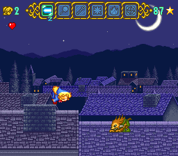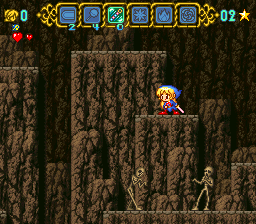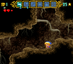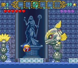 The princess is quite adept at using her sword, even stabbing upwards and using it as a pogo stick to skewer enemies from above. However, as mentioned above, the crux of the gameplay is the princess’ magic spells: she starts with a standard beam and can find a new power in each level, and use them by consuming a certain amount of mana, represented by golden stars. These are easy to come across, by defeating enemies, inside treasure chests or just lying in the open. Among the spells there is a grappling chain thing that can be used without consuming stars, in order to cross chasms and such. The other powers are mostly offensive magic (grenades, flames and ice), but there’s also a Sonic-esque spinning move that can be used to climb on walls found late in the game. All spells also have a secondary more powerful attack mode that costs many more stars, covers a good portion of the screen and that can be activated by pressing Select after highlighting them in the bar. However, these “smart bombs” are barely ever useful and feel like overkill on the princess’ (and the designers’) part.
