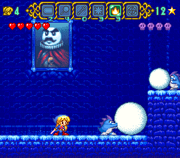 The art style and character design flip-flops between being cute and serious: the anime-styled intro is sweet and charming, and several enemy creatures are typical of cutesy platformers such as puppet-like soldiers, gnomes, bunnies, bouncing jellies and penguins. But we also have to fight things like angry ogres, floating masked mages, eight-armed Hindu-like statues and stretchy humanoids that look like desiccated corpses. The same can be said for the various mid-bosses and bosses, going from goofy beings like a flying fruit with a face and a mustachioed snowman, to a floating stone head with three scowling faces and a skull surrounded by a ring of other skulls. In this regard it reminds a bit of the Cotton series, similarly uncertain on whether it wanted to look dark or cutesy.