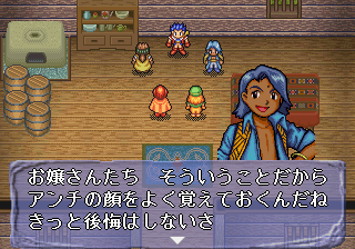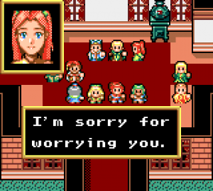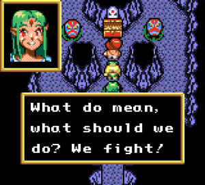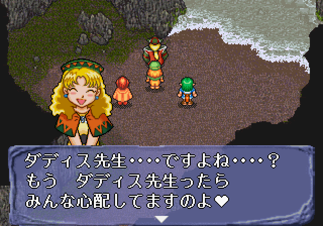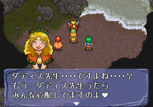 But there’s some weirdness that manifests itself in other ways. An early scene in the Saturn version has Ellie stripping her clothes off so her teacher, an adult man, can paint on her. For magical purposes, of course. Nothing is presented as predatory, but it’s still creepy. About halfway through, two of the characters get married. Teenage marriages have been a thing throughout history and fiction, but considering the tone of the game, it’s still incredibly bizarre to see fourteen year olds on their honeymoon. And Barua’s infatuation with young boys is one of those things that’s called out as disturbing even by the other characters. There have been hundreds of villains in RPG history, having committed all kinds of acts of genocide, but this is one of the few to actually feature an implied pedophile.