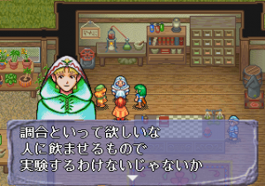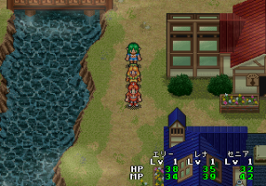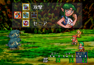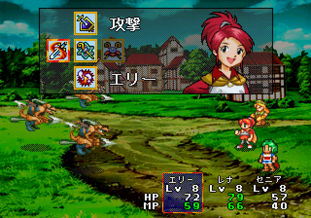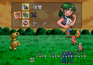 The battle scenes look like the other Lunar games, but it doesn’t quite play like them. Gone are the movement limitations and multiple turns, though area of effect spells are still present. It does boast six party members in combat at once, one more than the other Lunar games, and double the amount from the Game Gear game. As with before, much of the fighting is based on exploiting elemental weaknesses by using specific spells. Also new are fusion spells – if two characters use (pre-determined) compatible spells, the game will give a hint that you can learn something new. Then you trek back to one of the professors, who will then teach you that spell.