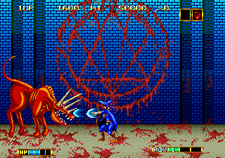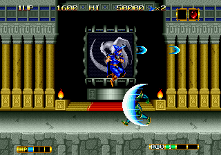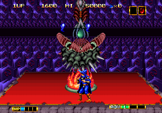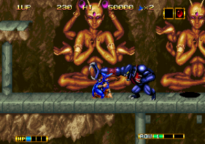 This game looks really dang good for the time, a fine demonstration of the Neo Geo’s awesome 100 Mega Shock power. Even today, it still looks rather impressive with its large smoothly-animated sprites and impressive rich-color backgrounds. From the multi-armed vaguely Hindu statues in the first level to the ornate palace hallways of the sixth, it’s tough to keep your jaw closed for an entire playthrough while marveling at its diverse visuals. The bold graphics are met with an equally ace soundtrack, loud and dynamic while keeping up a sense of urgency as demonstrated in the gripping first stage music. The second level has this sort of weird electronic synth warble to it that sounds oddly cool, and the fearsome boss track leaps up and tells you “THIS IS A BOSS” point-blank to your face. Even if the aesthetics aren’t up to the level of later Neo Geo games, they still hold up quite well for being an early release on the system.