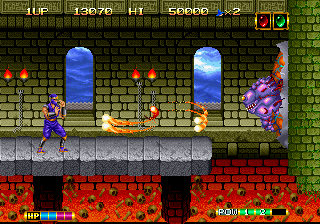 If you want a REAL challenge, the home console version of Magician Lord kicks you back to the start of a stage every time you continue, making the latter half of the game utter pain to try and beat. As a compromise, Elta can take three hits instead of two, and six instead of four if he finds a transformation orb. It’s still not quite enough to tide over the flagrant frustration that builds upon each new level, and the console version is only recommended for die-hards. All of its re-released emulated forms on various consoles – on the Wii Virtual Console, on the SNK Arcade Classics Vol. 1 for the PlayStation 2, Wii, and PSP, and as a downloadable game on the PlayStation 3 – use the rules of the console version.
