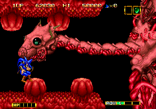 Make no mistake, however, as enemies ARE tossed at you quite liberally. Magician Lord is chock-full of impressive baddies with designs ranging from fantasy to eldritch. The first level alone has Cthulhu-esque squid spawn and stout demons with extending claws. Veiny winged grounded electro-birds, weird skeletons that barf eyeballs, and viciously agile catgirls are among the rogues you must face in your quest. The bosses are especially impressive, with each level having a sub-boss to fight just before the big boss. Some mid-bosses include an odd fish beast who takes diagonal dives at you and a warlock who conjures up horrid eyeless creatures, but the large end bosses are even more interesting. The first big bad starts out as a creepy stone face that crumbles to reveal an egg, which then hatches to reveal an ugly purple head that spits out fire shots. Other such wretched abominations include a sphere made of tree roots that fires off energy daggers, a long-necked parasite whom you fight in the mouth of an even bigger beast, and a frightening hell-hound with spikes where its eyes should be (who is sadly the easiest boss in the game).