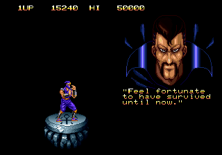 Magician Lord has a lot of style to spare, but the cherry on top is its terrible butchering of the English language. A fondly remembered aspect of SNK (and ADK by extension) was its failure to properly translate Japanese to English, thereby giving rise to the term “SNKgrish” where any text becomes a new dialect built upon the foundations of typos, malapropisms, and total nonsense. In this case, central villain Gal Agiese takes the liberty of taunting you before fighting each stage boss with a severely nonsensical phrase. Such gems of eloquent poetry include: “What imprudence, you human being! Face your trial by God!” “You, persistent guy. But your life ends right now.” “Your are very dangerous. Be dead down here.” These bits are even voiced in English by a massively bored or stoned actor who channels Lorenzo Music’s deadpan portrayal of Garfield. It really has to be heard to believe, but the most infamous phrase attributed to Gal’s presence is what you see when you run out of lives. As the continue counter ticks down, Gal’s stern countenance stares you down as the proclamation of doom rings above his neatly cropped coif: “Again changes to Hell.”