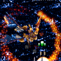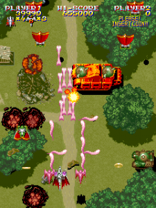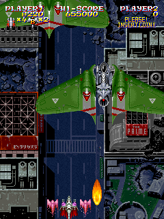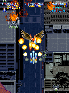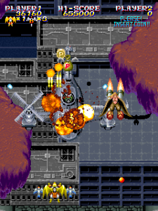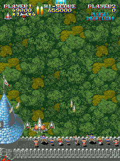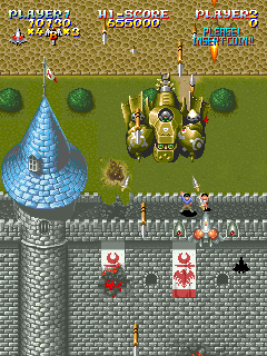Similar to MUSHA, another one of Compile’s titles, there’s a recurring flunky named Bashinet, who is relegated to mini-boss status throughout most of the game. He starts as a gigantic red fighter, but eventually grows a full mecha body. One of the final stages appears to be little more than a victory run, with the entire kingdom coming out to congratulate you – until a wrecked Bashinet comes from the sidelines and momentarily threatens the life of the monarchs, leaving you to save the kingdom once and for all.