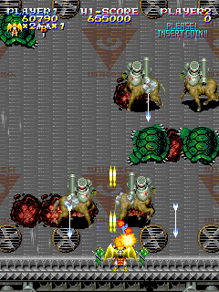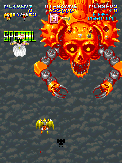 Even though not all of their games in a series proper, they all share many common elements. They inherent an aspect of Psikyo games, in that they’re filled with strange player characters, although these generally just appear in the character select screen or in between levels to say something silly – in game, you’re usually piloting some type of ship. Many games share characters too, and one of the later games, Armed Police Batrider, even reuses many of the same bosses. The action is usually fast and intense, somewhere in a midway point between Psikyo and Cave, as they’ve got some outstanding production values, with some high quality sprite work and generally excellent soundtracks. Unlike many arcade games, there are also cheat codes hidden in many of them, allowing you unlock secret characters or alter small things, like color type or extra option formations.