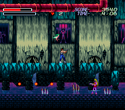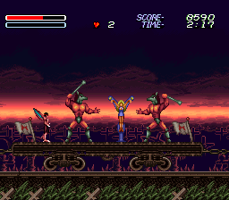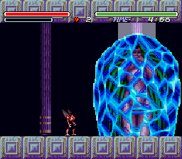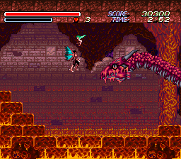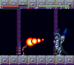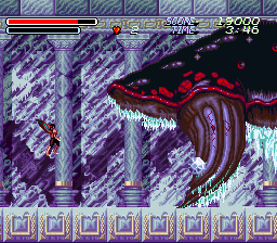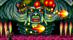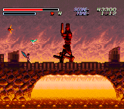 The second stage is a ruined city, overrun by flora, completely desolate except for some monsters and man eating plants – some of the flowers even have creepy faces on them. This boss of this stage is a gigantic bloodshot eyeball – which rotates courtesy of the usual Mode 7 fanciness – and fires lasers from its pupil. In the next level, you board a train made of bones, against the background of a blood red sunset, with all of the skull cars traveling at suicidal speed. There’s even a scene of a girl in chains being flailed by evil horsemen, whom you are utter incapable of saving. Later areas take you through a crystalline, ice-like palace, and then through more traditional underworld settings, like a lava stage.