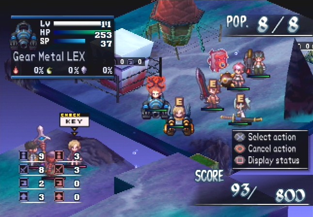 Nippon Ichi’s Makai Kingdom combines bits and pieces from Disgaea and Phantom Brave, and tosses them in the blender to create another excellent, if somewhat disjointed game. The gridless battlefields from Phantom Brave are back, although this time you actually control your character’s movement, as opposed to clicking their destination with a cursor. You still make characters by confining them in objects, but you only do this during their initial creation, as opposed to doing it every stage. The time limit for each character, thankfully, has been completely abolished. The turn-based system from Disgaea/ La Pucelle has returned, meaning you set up all of your characters to attack before telling them to execute their actions, although the crazy combos are gone. The same equipment system has also returned, allowing you to once again equip a variety of defensive items on your characters (although you’re still drastically limited in the use of items.) There aren’t any Geo Panels or Dark Portals or other crazy bits of terrain, which is a little disappointing.