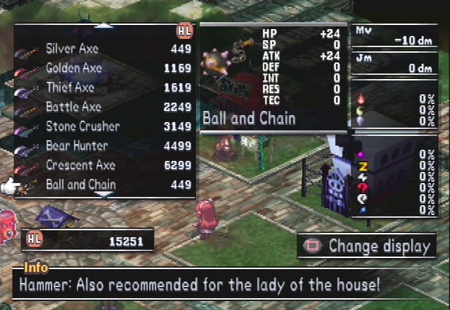 With Zetta bound to a book, there’s little he can do but conquer other netherworlds and attempt to rebuild his kingdom. Along the way, there are several gods who stop by and lend a hand. You can choose any of them to write in the Sacred Tome, which determines the type of stages and monsters that are randomly generated. It’s a colorful cast of characters, to be certain. Laharl, Etna and Flonne return as hidden characters, as well as Marona and Castille. Asagi also makes an appearance – Asagi was meant to be heroine of a Nippon Ichi title, but she keeps getting ditched for other protagonists. She becomes a running joke in later games.