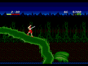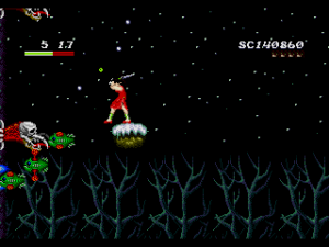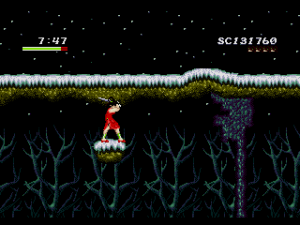Curiously, the game abandons the pursuit of power that characterizes similar games. If anything, their only purpose is to undermine it. Yohko’s clumsy swordsmanship, for example – if you hit the button too fast, she’ll stop mid-swing and start over, making it extremely ineffective unless you time your hits right – stifles any feeling of accomplishment one might get from fending off the various monsters that populate the levels. And the levels themselves are barely more forgiving. Few of the branches and ledges can support Yohko’s frame, and the serpentine paths can force you to retread the same ground to advance through the stage. Even if they don’t outright deny any feeling of accomplishment, the levels still expend a lot of energy delaying it.