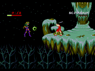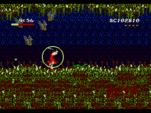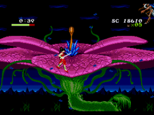 Despite its disinterest in telling a story, the game certainly looks like Valis, or any other Telenet/Wolf Team-developer titles, right down to the featureless face of the heroine. And like many of their titles, it doesn’t feel right either, with slghtly awkward controls and monotonous levels that don’t really develop so much as meander (though there are some branching paths). For example, the first stage is filled with winding vines, but it’s not entirely clear what parts you can walk on until you try them out. Neither the enemies nor Yohko react much to damage – in fact, taking hits is a little bizarre, because there is no invincibility period, but if you manage to avoid another attack for a second or so, Yohko will regain a slight amount of health. It’s not much, though, and you can still find yourself dying in three or so hits.