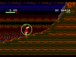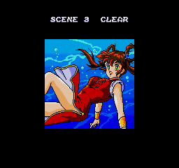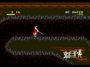 Devil Hunter Yohko, of course, was a response to the “magical girl” craze popularized by Sailor Moon (though the trope existed long before). While that series, as with most, was aimed at girls and young women, Devil Hunter Yohko was plainly aimed towards older boys and men, being a darker anime with substantially more violence and nudity. The heroine is an everyday girl, who maintains her family’s professions as a demon slayer, and fights them in a stylish red Chinese dress. For a game based on an anime, there’s little in the way of cutscenes, just brief images that open the game and close out each level, without even any dialogue.