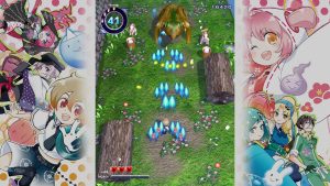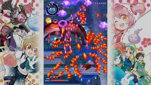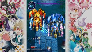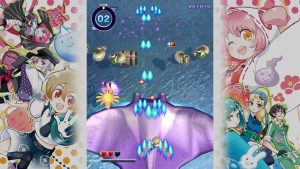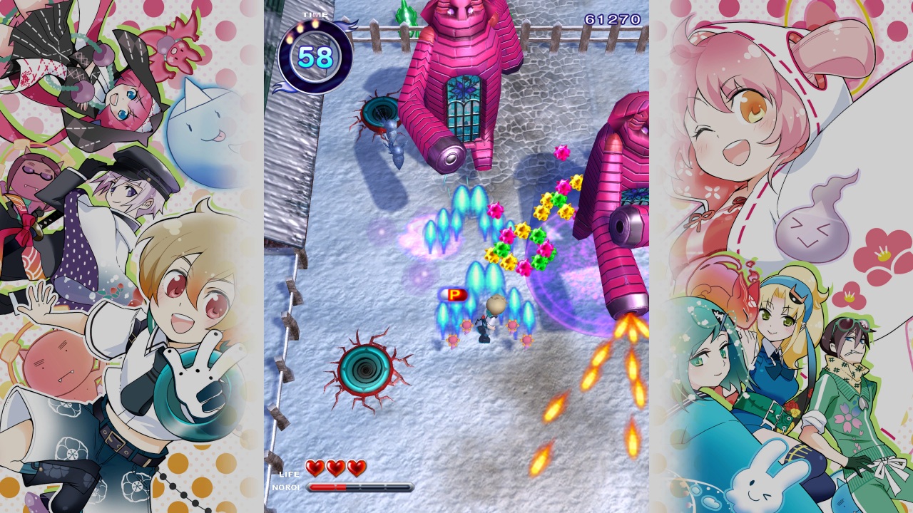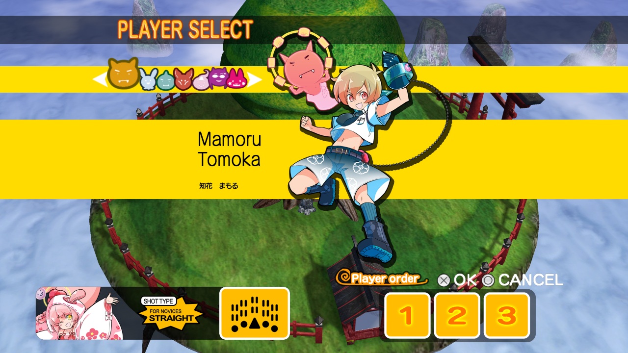 Each of character wields their own element, with unique rapid firing patterns and familiars that supplement their attacks – Mamoru has the power of lighting, kimono-clad schoolgirl Mayuno uses snow, tough guy Narai has wind attacks, high school girl Beniko wields fox fire, and Fululu has the power of flower. The character selection screen offers suggestions to which characters are best for novices or experts. By holding down the fire button, you can also lock your shots while moving in different directions.