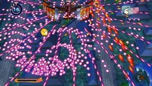 Mamorukun Curse! also has an unusual stage selection system. Each new game begins with a brief shoot-em-up prologue stage, after which you can choose from five levels – the Home of the Cherry Blossoms, which transitions from spring to winter land over the course of the stage; the Entrance to the Underworld, where you stroll through shrines at nighttime, the Aerial Garden, the amusement park of the underworld; the Southern Temple, where you spend most of the stage riding on the back of an enormous manta ray and take on a fleet of pirates; and the Karakuri Castle, which is filled with traps and houses a giant mecha at the end. The stages increase in difficulty as you continue, but you only need to play four out of the five before moving onto the last battle. Additionally, you can also opt to replay boss battles at a higher difficulty, which is a good way to get extra points and gain some extra time, as long as you complete them quickly. There’s also an additional extremely tough boss battle you can fight, as long as you’re up for the challenge. Adding in these extra boss battles is unusual since it encourages artificially extending the playtime for those playing for score.