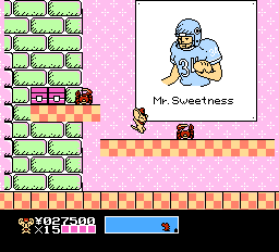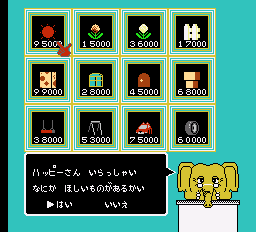 The little mice can technically kick, but their the attacks have no range, so it’s usually easier just to avoid enemies. The main goal is to collect as much cash as possible in each stage. While they can technically take a number of hits, taking damage also depletes a large amount of money, which is a more severe punishment. At the end of each level, you can use your cash to buy assorted gifts for your parents. Apparently the Mappy family starts off near homeless, and the kids can buy windows, picket fences, tire swings, cars, the sun (!!), and other assorted decorations to thank their parents for bringing them into the world. Like Mappy Land, it’s this sort of ridiculously adorable scenario that sets Mappy Kids apart from other platformers.