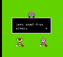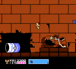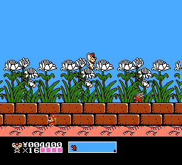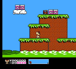 The gameplay has been changed to a generic 8-bit platformer, with barely any trace left from the original Mappy games, beyond its characters. It’s a bit like Capcom’s Rescue Rangers, in that the mice are supposed to be miniature, running around oversized environments, mostly consisting of houses and yards. It also features two player simultaneous play.