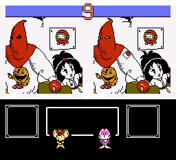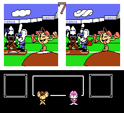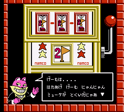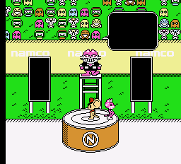 Mappy and Mapico aren’t the only ones that have spawned though. At the end of stage, you play a slot machine to face off against one of Goro’s three kids. These minigames are generally pretty simple: one is basically a sumo match, as you bump butts to knock the other off a small platform; another has you examining two pictures and trying to spot the differences. These areas feature some amusing cameos from assorted Namco games – one of the pictures you have to analyze features the hooded enemies from Rolling Thunder kidnapping Ki from The Tower of Druaga, and another has them playing baseball (a reference to Namco’s Family Stadium, more widely known amongst English speakers as Tengen’s RBI Baseball). You can also find the hoods of the Rolling Thunder guys lying out as laundry during some of the stages, though due to the coloring, they look even more like KKK outfits than they even did originally.