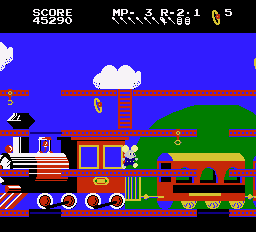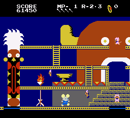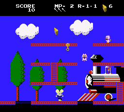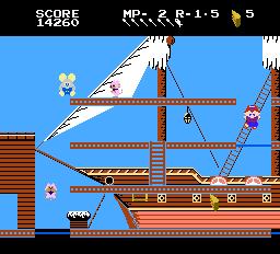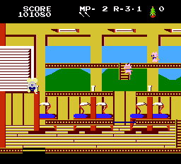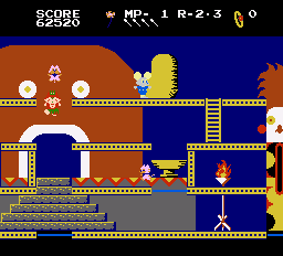Most of the levels follow the standard Mappy stage construction, but a couple of them try to spice things up by adding extra platform elements. The third level, the jungle, is short, and consists mostly of vines you can climb on and moving trampolines. Unfortunately the controls are too rigid, and Mappy’s new jumping ability is borderline useless, so these stages ended up being the weakest part of the game.