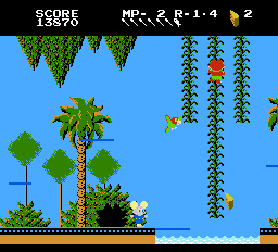 The graphics hail back to the early Famicom days, when the artists hadn’t quite figured out how to work around the constraints of the platform and develop attractives sprites. The characters are larger than the arcade title, but the whole game has an ugly, box look to it. But these are somewhat negated by the little details that add a substantial amount of personality. Primarily, the animations of the Mewkies bouncing around the cat toys, throughly entranced, is simply adorable. Additionally, in each stage, Goro is dressed up in an appropriately themed outfit. He’s a train conductor in the first stage, he has a Polynesian grass skirt in the island level, he has a Snidely Whiplash villain mustache in the Wild West stage, he’s a ghost in the graveyard stage. And pummeling enemies off the stage never stops being comical.