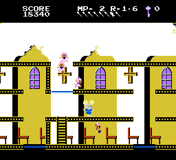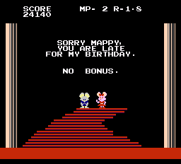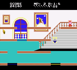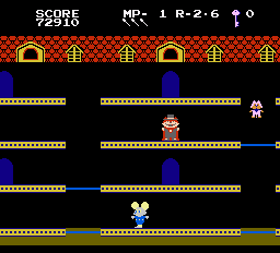 There are eight unique levels, which loop four times, for a total of thirty two levels. At the end of each loop, there’s a quick bonus stage where Mappy must reach his beloved Mapico within a time limit. Thankfully, you don’t lose any lives if you’re too slow, you just get an irritated message from Mapico admonishing that you’re late, and must retry the stage until you get it right.