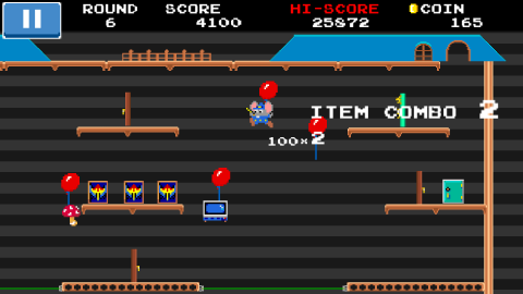The game works well with touch controls, since you can only walk left and right (you need to touch doors to open them). The freeform level design generally works too, with one caveat: the trampolines. In the original game, you couldn’t be damaged by enemies if you were both bouncing, but here, the physics are adjusted that it’s fairly difficult to avoid an enemy if they’re bouncing on a trampoline – it’s best to hope that they’ll simply jump off on their own. Some of the trampolines (and floors) make this more difficult since they’re sloped, which in turn changes the trajectory a bit. Otherwise, this is a pretty decent game, and certainly a better iteration of Mappy than any of the Namco’s older attempts.