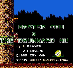 You will likely have noticed at some point that not all NES carts are of the standard flat gray variety. These are unlicensed NES carts made by companies who somehow skirted Nintendo’s approval, such as the flat black carts of American Video Entertainment or the glitzy gold carts of Camerica. The most famous unlicensed publisher was Tengen, who primarily specialized in converting Atari’s arcade hits to the NES (and were often at the bad end of several lawsuits versus Nintendo). The most infamous unlicensed publisher was Color Dreams, whose pale blue carts soon became known as a mark of anti-quality. Before they changed their name to Wisdom Tree and specialized in the development of infinitely mocked religious-themed games, they published a few games by a Taiwanese outfit known by several names like Joy Van, Thin Chen and Sheng Qian, but they are most often called Sachen. Sachen has made about seventy unauthorized NES games and very few of them are ever worth playing. Master Chu and the Drunkard Hu is a fair example of their general quality; i.e., pretty damn awful.