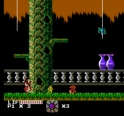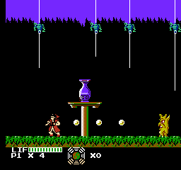 Playing as Master Chu or the Drunkard Hu (note that an alcohol reference would never be on a sanctioned NES game), you have to collect eight yin-yang symbols in each level and kill the boss. Simple enough in theory, but there are many frustrations that make the process tedious in practice. First, your only weapon is to shoot out tiny magic bullets that often take several shots to defeat most enemies, even the small snakes and spiders that would be cannon fodder in any other game. You can collect these scrolls to shoot two and then three bullets at a time, but taking just one hit drops your power down a level, a similar controversial system as seen in Castlevania: The Adventure. The other action button flicks out what seems like it should be a melee weapon, but it’s completely useless for dealing damage and only exists to block enemy projectiles, and it’s even sort of useless for that purpose too. This stupid block replaces what would normally be the jump button, where you have to press “up” like a Commodore 64 platformer, and you just never quite get used to it.
