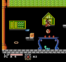 Your character moves sluggishly around the screen, but each stage is relatively small. Each stage also looks very similar to each other except for the first level, which takes place outdoors as indicated by the sky and the trees, and a level near the end which takes place in the clouds for some reason. Almost every other level looks the exact same, with similar ornaments and statues making them seem like monotonous corridors of a Chinese palace. While the levels are just flat chambers, your goal of finding eight yin-yang symbols causes you to stay in them for longer than you’d probably like. Most of these symbols are hidden, occasionally in not-very obvious places, and you just have to keep shooting air in order to uncover them while pests chip away at your lifebar. The enemies are pretty generic, like the aforementioned snakes and spiders, and then there are these weird blue worm-like things and these obnoxious floating halos which are hard to dodge. With your slow speed and odd jumping physics (not to mention there’s no movement inertia if you just fall off a ledge), you’ll inevitably take damage because your character is awkward to control. You can grab these moving little men to fully restore your life and the game is somewhat generous with bonus lives, but it’s cheap balance to compensate for fundamentally flawed gameplay.