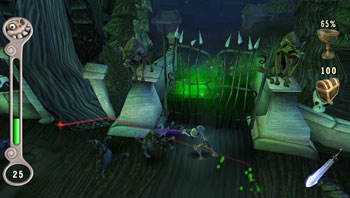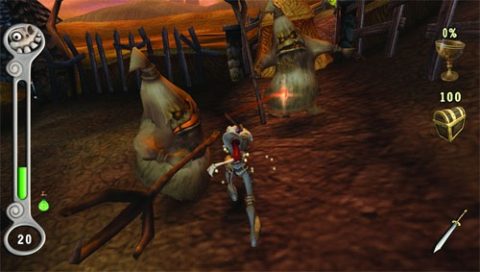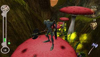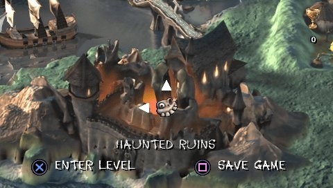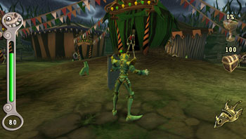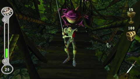 To be honest, though, this is not a shot-by-shot remake of the original with better graphics, but more of a “reformulation”, since several levels have been cut, others were merged and some additions more fitting for a portable system were made. And, while the original was a dark fantasy game with a bit of British humour, Resurrection‘s tone is fully comical, with lots more gags and Zarok being turned from a menacing nemesis to a Saturday morning cartoon villain. Now almost everyone is fully voiced… everyone but Sir Dan, who has reverted to grunts and noises. Also, his design has been slightly changed, with the armor baring his midsection, as if it weren’t clear he’s a skeleton. Finally, the developers added an annoying helper character nobody asked for: Al-Zalam, a genie (which looks more like an one-eyed gremlin than anything) who lives in Dan’s empty eye socket. It was meant to replace Morten the worm from the original. It should be noted, however, that original creators Chris Sorrell and Jason Wilson weren’t involved with the project and weren’t too happy with all the changes made to their creation.
