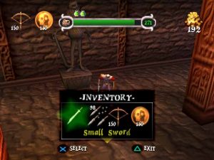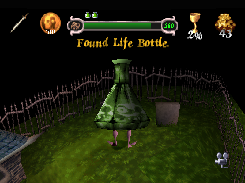 Dan has also only one chance at life, but he can pick up Life Bottles that act as additional life bars and can be replenished by using the Life Fountains that can be found all around the place. Other useful items and weapon repairs can be bought from the sarcastic talking gargoyles with the money found in bags and treasure boxes. Having life bars that can be refilled over and over seems to be a pretty big advantage, but on the other hand it is pretty common to lose energy or lives because of the camera issues. This was the first 3D production of the developing team, and it shows: the camera moves irregularly and is disorienting, especially when facing several enemies together. Hitting enemies with melee weapons is quite frustrating sometimes. MediEvil was also one of the very first games to take advantage of the PlayStation’s joypad’s analog controls, and that added to the difficulty of controlling Dan.