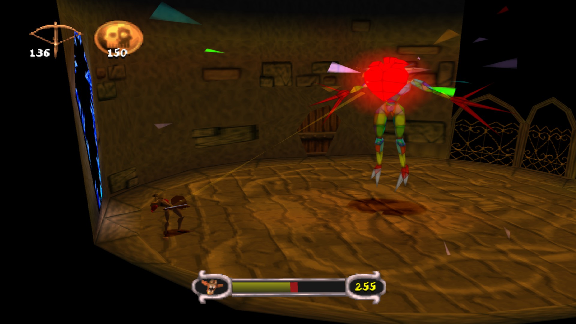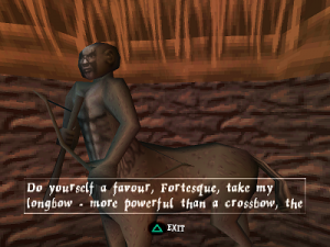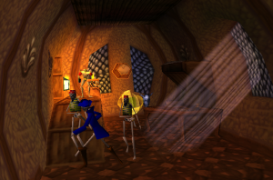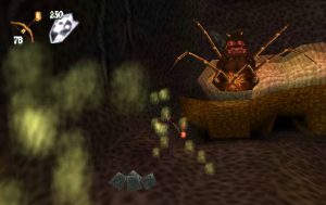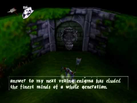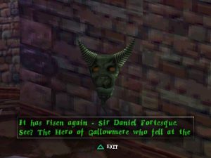 The dev team being independent and a newcomer in the world of 3D games also meant that they had more creative freedom than most, and this is evident in some of the more original levels, for example when Dan is magically shrunk in order to enter an anthill and rescue some oddly deep-voiced fairies from the ants and their queen (a quest inspired by Aliens, according to the game designer). Or when he has to solve riddles given to him by another gargoyle in a hedge maze full of crazy monks and living topiary statues. The enduring popularity of the series most likely comes from the effort the devs made in creating a bizarre dark fairytale world full of personality. Some of their ideas, however, had to be cut because of time constraints. Several pieces of promotional art showed a small worm besides Dan’s skull: its name was Morten the Earthworm and it was supposed to be a playable character in a few platforming scenes which then were removed from the final release.