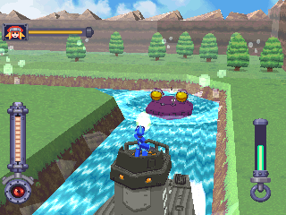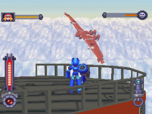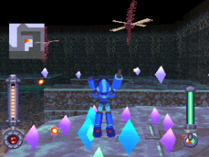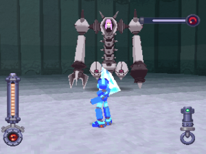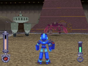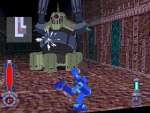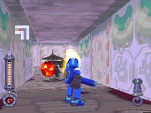 It is within this tower protruding high above the waves that players are flung into and forced to tangle with the main concern of the Legends series, sink or swim. Volnutt controls like a stiff tank, a far removal from the sublime freedom of all-directional movement granted in the earlier-released Super Mario 64. This is, in large part, no thanks to the platform of choice. Being developed in a pre-Dual Shock PS1 era, the player is stuck with only the D-pad and L1 & R1 buttons to move, turn, and strafe. This clunky way of maneuvering makes it difficult to veer left and right, as turning Mega Man is a slow procedure, especially from a stand-still. Using a mixture of strafing and turning can speed up the process, even allowing a quick 180, but Volnutt is nowhere near as fluid or nimble as his 2D counterparts. Despite a pokey rotation speed, Mega Man runs at a constant jog that can only be slowed by holding Circle. This walk speed is only enforced in one early segment to get past kids blocking a door, but the theory is that a tiptoing Mega Man might be able to sneak past Reaverbots, in theory. R2 serves as a nice lock-on for enemies so you won’t have to worry about positioning yourself just to land a shot.