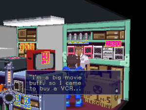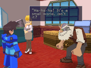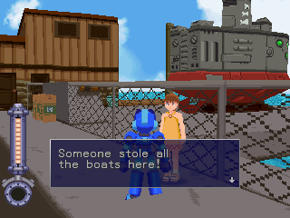 Despite the stiff framework, there is a lot of heart in the cast and the environment. There’s a sense of care and enjoyment in creating the town and scenarios, a kind of affection that seems rare in many games of today has has even developers of the modern generation lamenting “forcing”, as they say, gameplay into their cinematic interactive movies. With each major event passed, Volnutt can talk to the same NPC to find a follow-up to their given plot thread. A girl in the women’s clothing store will wonder which dress to buy before eventually picking one, possibly with your help. The baker’s wife will deliver her baby (again, with your help). The reporter will go inbetween stories off and on the clock, some of them even about Mega Man’s exploits. Even the Servbots have their own full-length tale of trying to open a burger joint on the island, starting with trying to get money from the bank, asking for a permit, and resorting to making a gross withdrawal which ends with a misunderstanding as the cops chase after them.