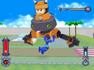 The difficulty feels rather front-loaded. The first real boss battles (or missions, as the game calls them) happen in sequence one right after another while you’re still rather weak and stuck with one close-range mine special weapon. Considering your speed and performance in the first tetra of Bonne battles measures how much collateral damage you’d have to pay for, it can cause quite a blow to your funds if you’re not at least powered up from the junk store or fully accustomed to circle-strafing. Even then, the scrambling to tackle new dropped-in tanks while defending the mayor’s office can be frustrating when trying to keep building demolition at minimal. At least Data is available midway and offers items if you ask for assistance nicely. The construction Marwolf battle is also a bit of a challenge as it comes soon after the initial gauntlet if you choose not to allot more time to beef up. It is also one of the few fights that isn’t a mere strafe-and-shoot affair. After running through a fleet of Servbot-controlled tanks, Mega Man has to climb up onto the excavated quarry cliffs while dodging blasts to wait for the exact moment to hop onto the mecha and blast its door weak point. Get knocked off (still rather easy to do if you didn’t go back and made Roll create the helmet), you’d have to climb back up again for another chance to leap back on. It’s almost like a Shadow of the Colossus boss battle years before the fact, and with quirkier tank controls to land precise jumps.