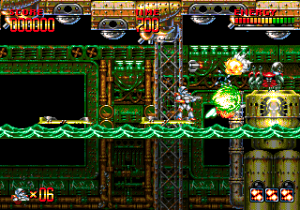 For the first time, Turrican diverted greatly from the formula of previous episodes. The biggest innovation in Mega Turrican is the Plasma Rope, which adds a Bionic Commando style swinging mechanic to the mix. The rope is used to reach higher platforms, as Turrican now jumps noticeably shorter than before. In exchange for the rope, Turrican loses his Lightning Whip; the Power Lines, another series icon, are replaced by more standard-looking smart bombs. The three main weapons got a graphical overhaul, but work just as they did before (a spread gun, a powerful laser, a bouncer weapon). Perhaps thinking that the unlimited Energy Wheel in the last game made things too easy (it can’t be denied), Factor 5 introduced a time-bar for its use: once depleted, only losing a life could refill it. This system was later adopted in both SNES games. Finally, a more common energy bar was adopted, made out of separate blocks, and after a hit Turrican has a little invincibility time, like in most other console action games.