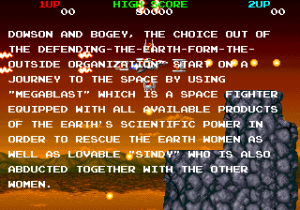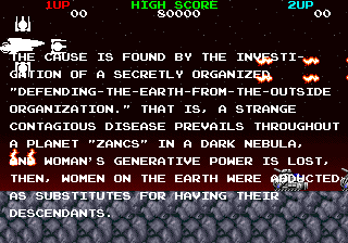 Despite being fairly dull, there are still a few interesting aspects about the game. For example, the storyline is absolutely insane. Taking place at the end of the 21st century, mankind has completely eliminated war and hunger. Except one small problem remains – the female population keeps disappearing! A team called “Defending-the-Earth-From-Outside-Organization” launches an investigation and determines that aliens from the planet Zancs have been coming to Earth and stealing all of the ladies. Apparently a disease rendered all of their women sterile, and Earth women just happened to be genetically compatible. Two heroes, Downson and Bogey, take off to rescue them. One of them also has a personal stake in the mission, given that their girlfriend, Sindy, was kidnapped as well. This plotline is related via a long, mostly incoherent rambling during the game demo, written entirely in “English” even in the Japanese version. What’s actually incredibly disappointing is that the setup doesn’t affect the game at all nor is it mentioned anywhere else in the game. There are no cutscenes of kidnapped women, nor anything to suggest that this whole thing was just a goofy B-movie setup tacked on to an otherwise incredibly generic game. How lame.