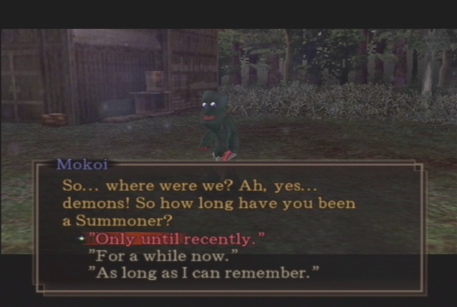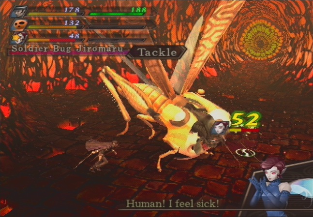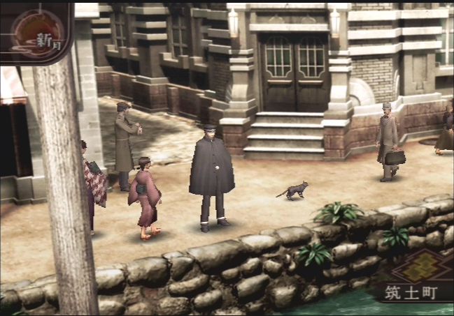 All of the backgrounds are prerendered, although the frame rate is much smoother than the previous games. It just feels awesome running around town, cape flowing in the wind and wearing an awesome hat, all while being trailed by a cute little kitty and whatever demon you have summoned. The music is pretty similar to Digital Devil Saga, although there's a flair of jazz mixed in with the hard rock. There are plenty of neat little touches for fans - the icon to represent demons is the same one used in the old FC/SFC games, and there's a mad scientist named Victor (just like the original Devil Summoner, except he looks more like a mad scientist than a sea captain), who heals you and gives advice on fusing and sacrificing demons. The overall atmosphere is less doom-and-gloom than most Megami Tensei games, what with the talking cat and all, although the storyline still isn't exactly light-hearted.